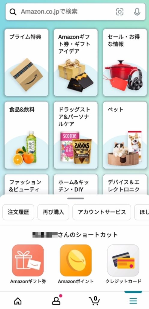 Amazonアプリの右下からメニュー画面を開き、アカウントサービスを選びます。