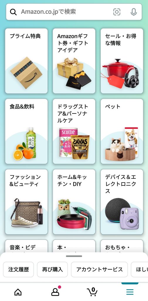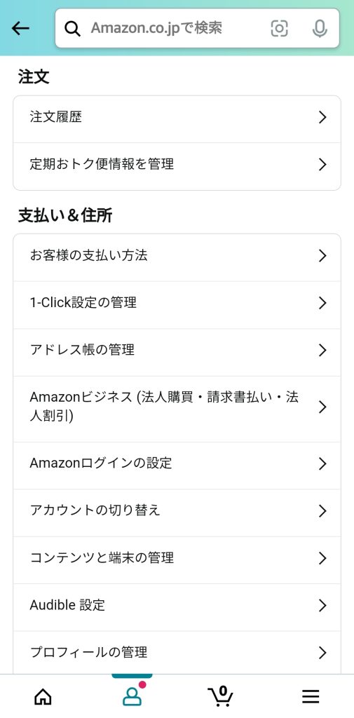 Amazonアプリの右下からメニュー画面を開き、アカウントサービスを選びます。