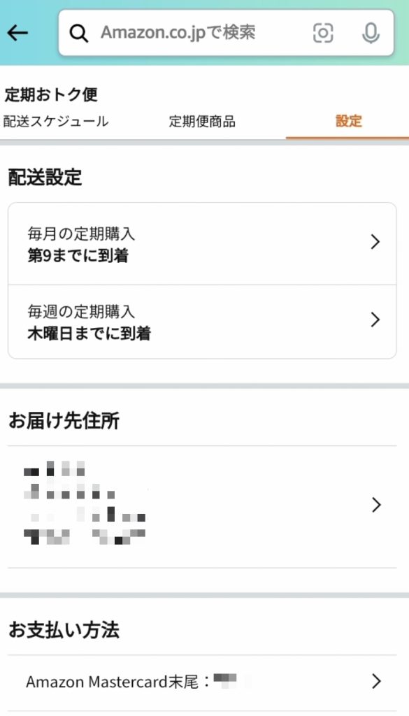 Amazon定期便の設定ページへ移るため、右上の設定を押し、支払い方法(今回だとAmazon Mastercard)をクリックします。