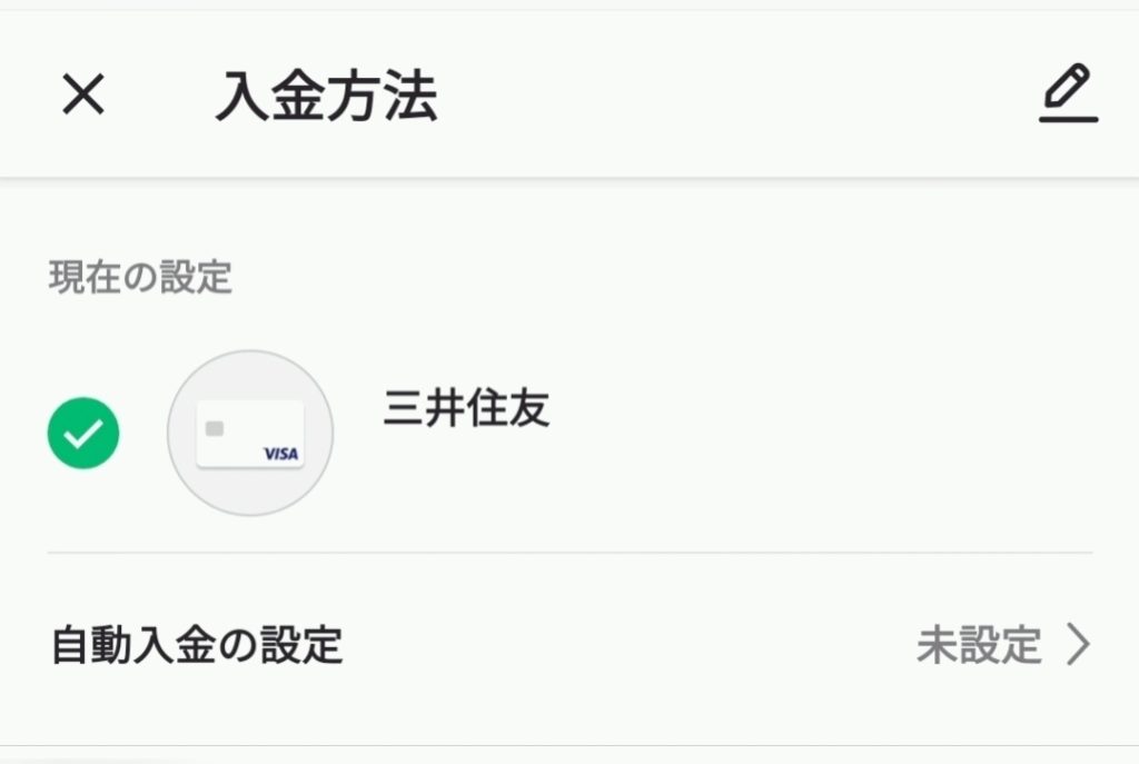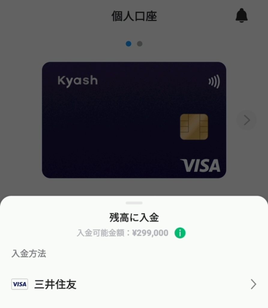 残高へ入金するメニューに移るため、入金方法を選択する(今回の例だと三井住友VISAカードを選ぶ)