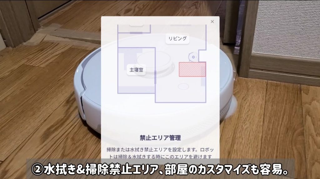 高機能センサーによってマッピングされた情報は専用アプリで確認することができ、掃除や水拭き禁止エリアもアプリで容易に設定することが出来ますよ!!