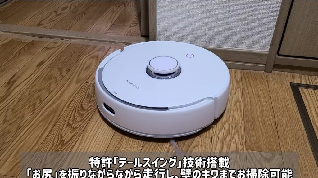 壁際を掃除する際には、Narwalさんの特許技術である【テールスイング】で壁の際まで清掃が可能です!!
