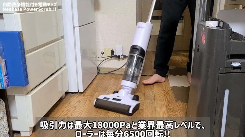 業内最高レベルを誇る吸引力18000Paのローラーモップは、毎分6,500回で高速回転します。