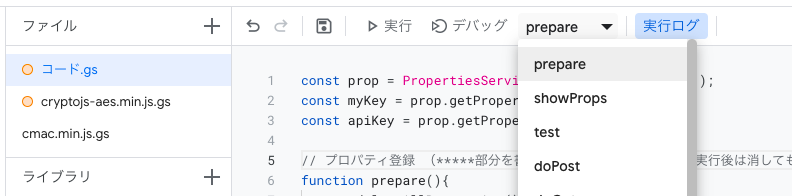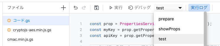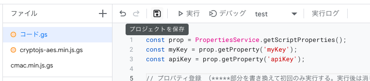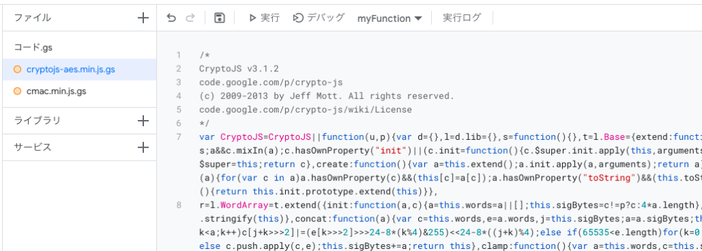 ファイル名を「cryptojs-aes.min.js」及び「build/cmac.min.js」に設定し、記述されているコード「function myFunction() { }」を消し空欄にした後、GitHubから得たコードをそれぞれペーストする。