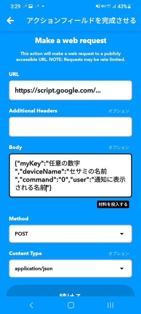IFTTTのwebhook機能を使用し、上記で取得した「ウェブアプリURL」にPOST送信をする。