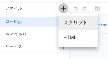 GASに戻り、「ファイル+」からスクリプトを押し、追加する。