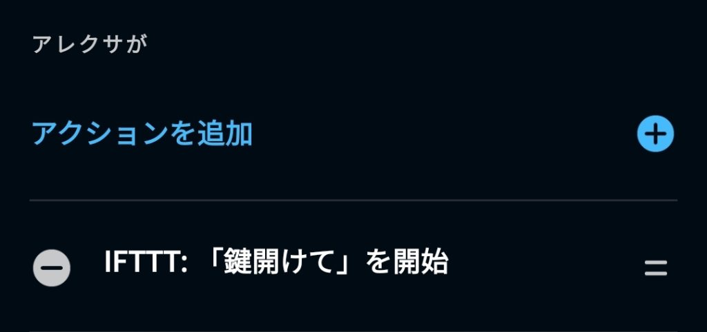 Alexa定型アクションの「アクションを追加」で「IFTTT」を選択し、設定したIFTTTが起動できるように設定する。